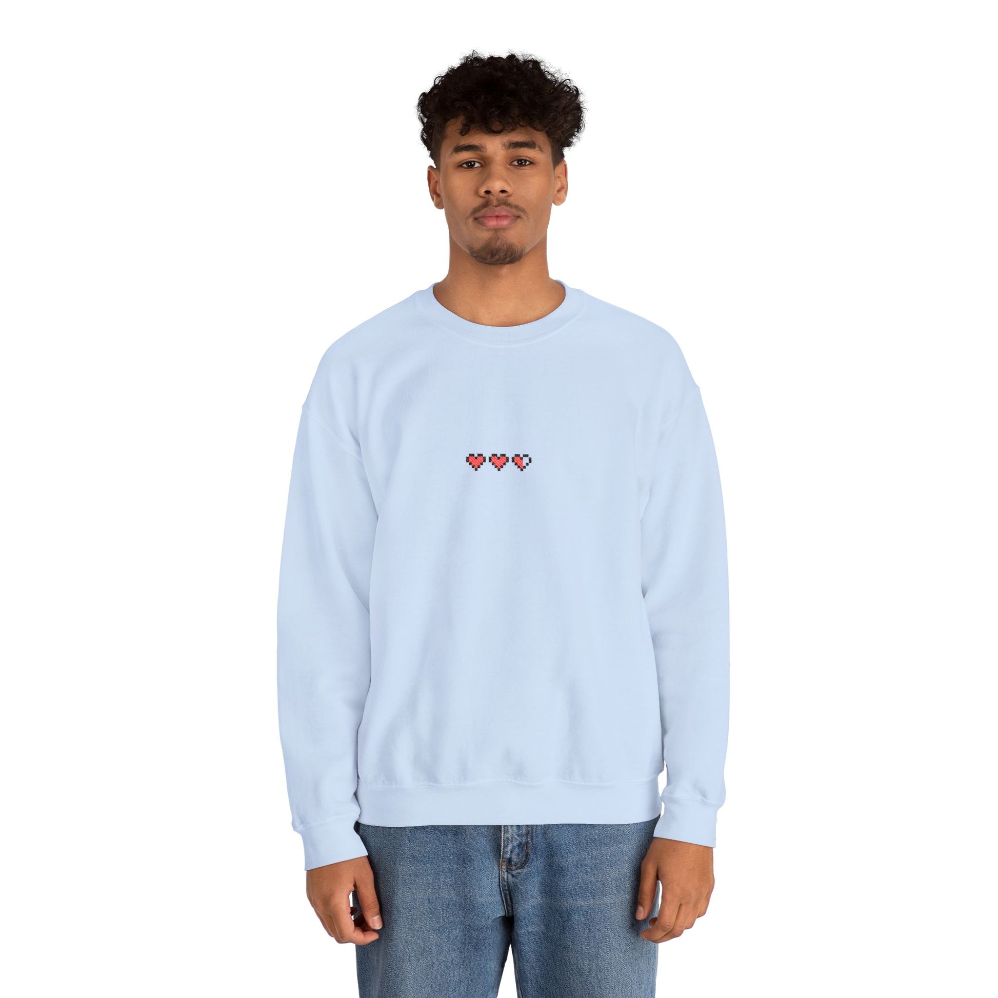 This heavyweight crewneck features the familiar row of 8-bit hearts — minimal, nostalgic, and instantly recognizable if you know. It’s less about gaming and more about growing up online, learning the patterns, and figuring out how to keep going when the bar isn’t full.