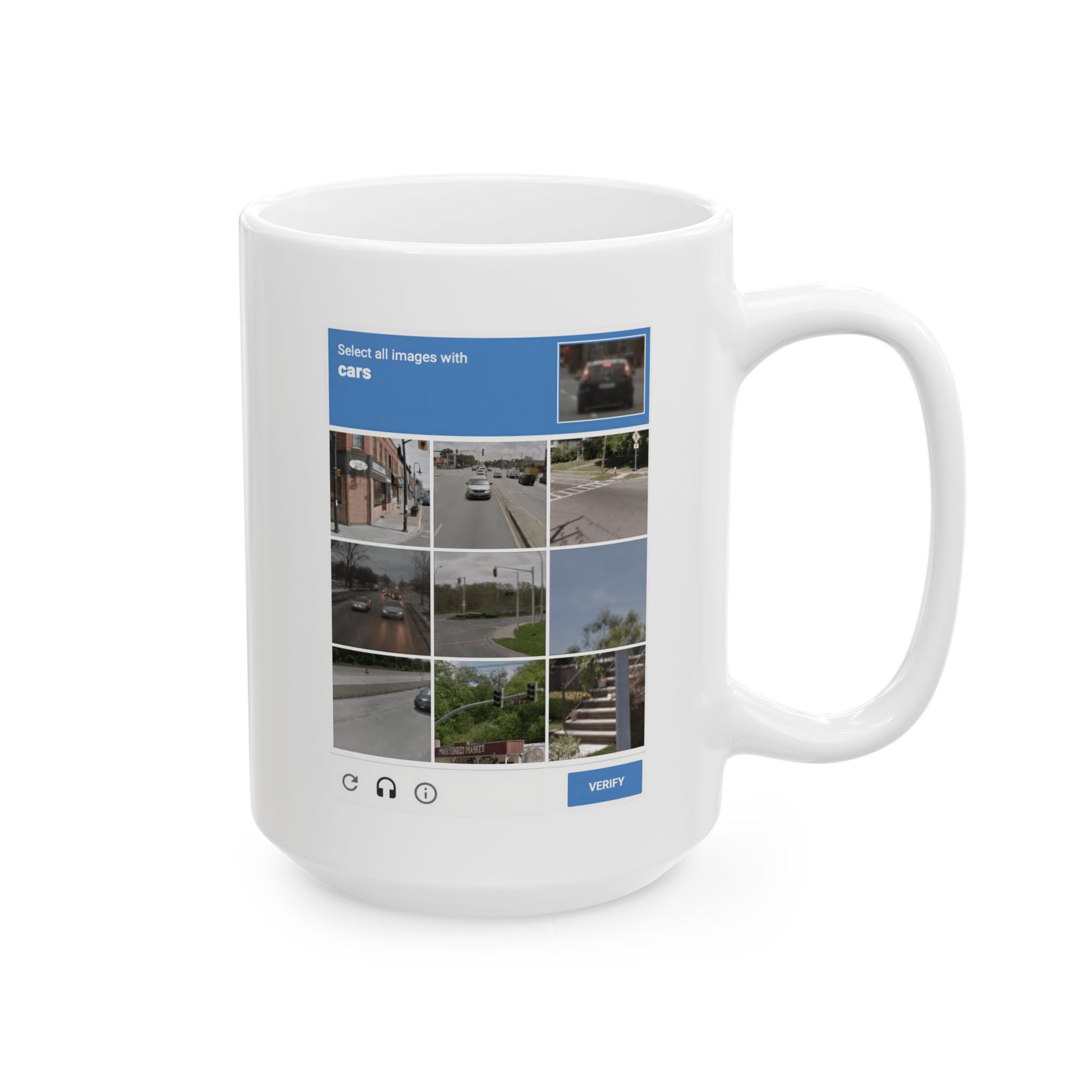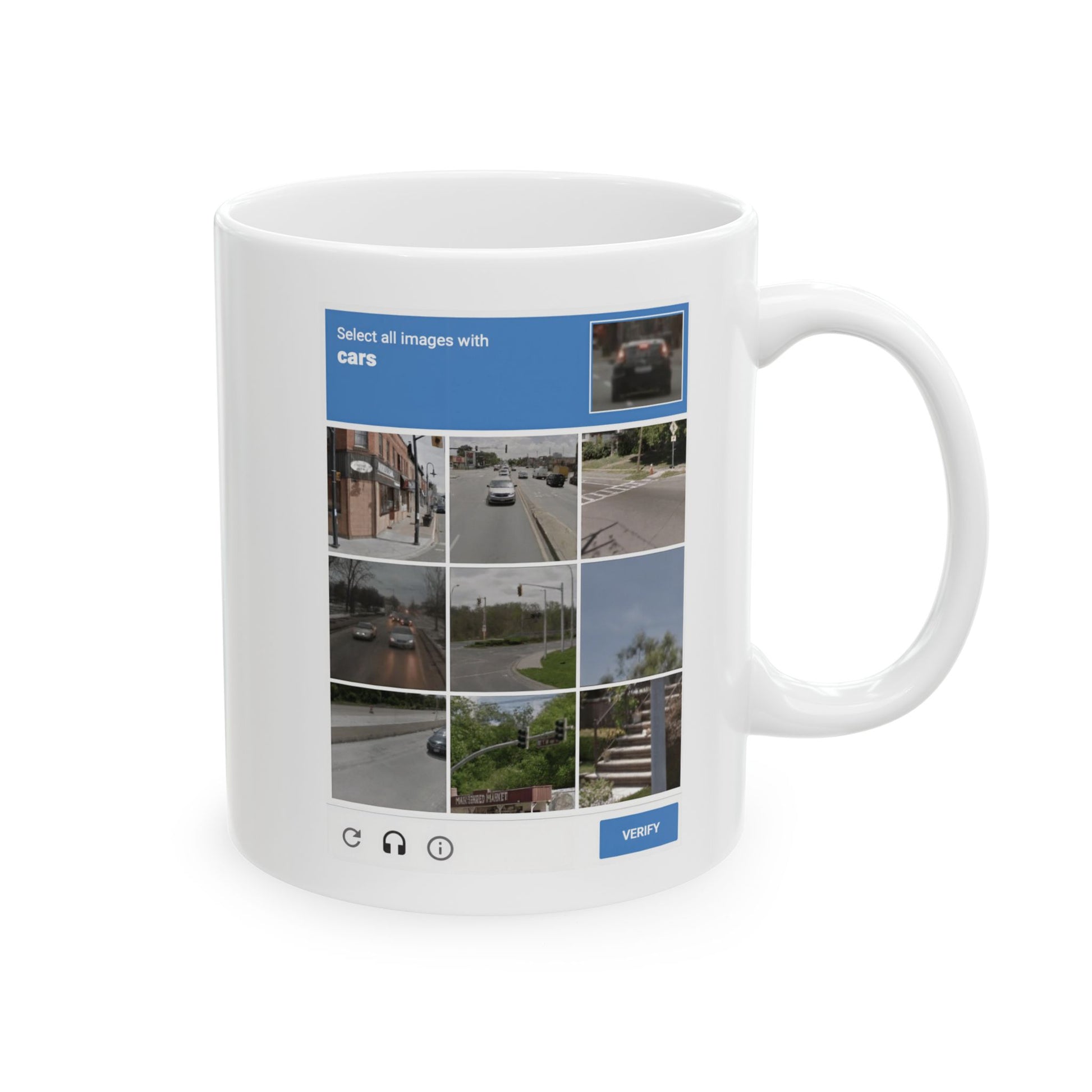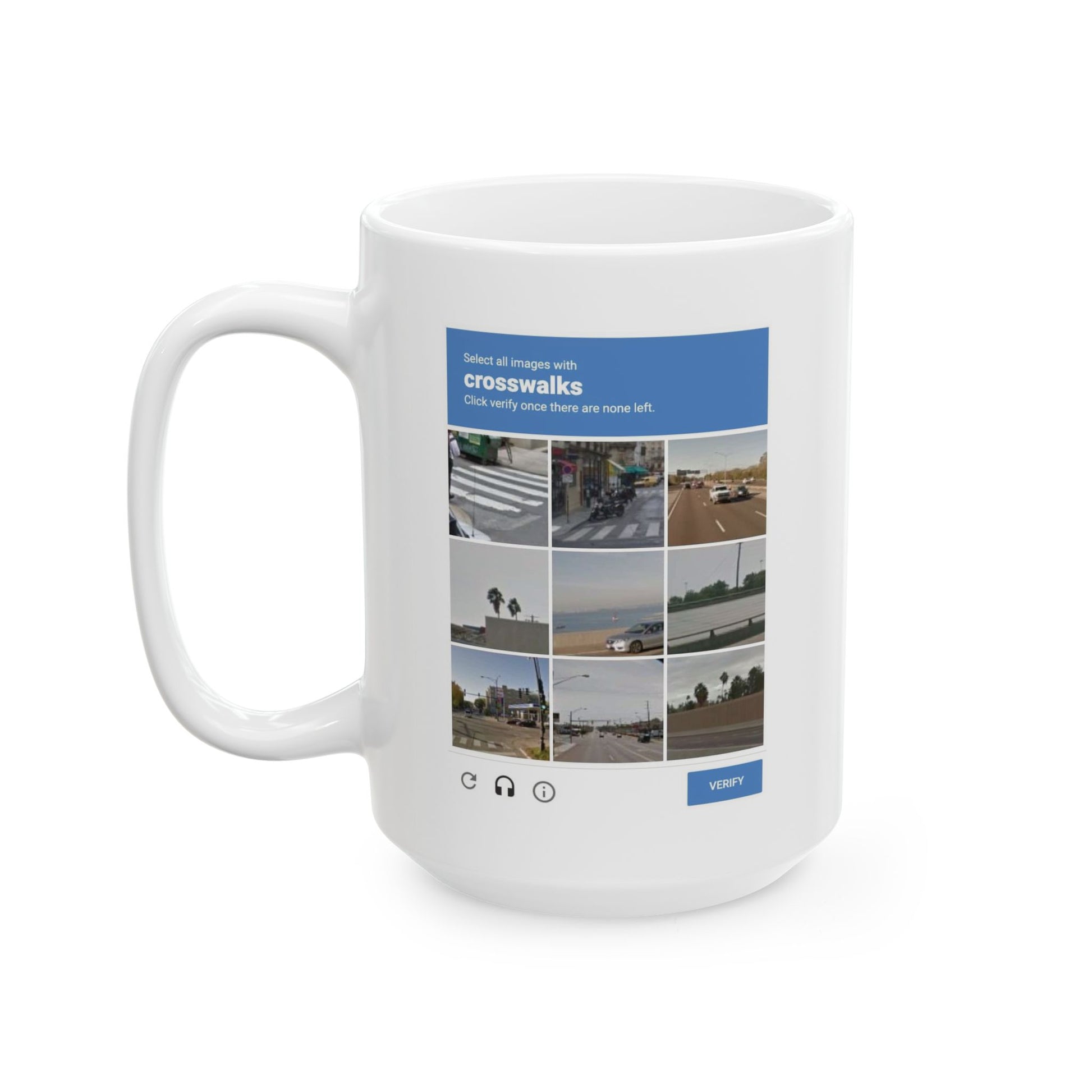 This two-sided mug captures the delicate ritual of proving you're human—every single morning. One side shows crosswalks, the other cars. Together, they form the existential CAPTCHA of modern life: a gentle reminder that your sanity is just one click (or one sip) away.